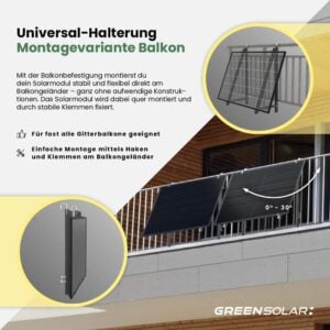 Mit der Balkonbefestigung für 1 Modul montierst du dein Solarmodul stabil und flexibel direkt am Balkongeländer – ganz ohne aufwendige Konstruktionen. Das Glasmodul wird dabei quer montiert und durch stabile Klemmen fixiert. Die beiden nahtlos verstellbaren Winkelhalterungen lassen sich stufenlos zwischen 0° und 30° einstellen, sodass du die Neigung je nach Jahreszeit anpassen kannst: 30° im Sommer, 25° im Winter – für optimalen Ertrag zu jeder Zeit. Die Montage erfolgt über zwei Haken, die direkt am Geländer angebracht werden. Zusätzliche Schraub-Klammern sorgen für sicheren Halt. Bei einer flachen 0°-Ausrichtung kann die Befestigung auch ohne Mittelschiene erfolgen. Die gesamte Konstruktion ist auf eine einfache Selbstmontage ausgelegt – unter Beachtung der Sicherheits- und Warnhinweise ist kein Fachpersonal notwendig. Eine durchdachte Lösung für alle, die ihr Balkonkraftwerk sicher und flexibel befestigen möchten. Die Balkonkraftwerk-Halterung ist bis zu einer Höhe von 7m zugelassen.