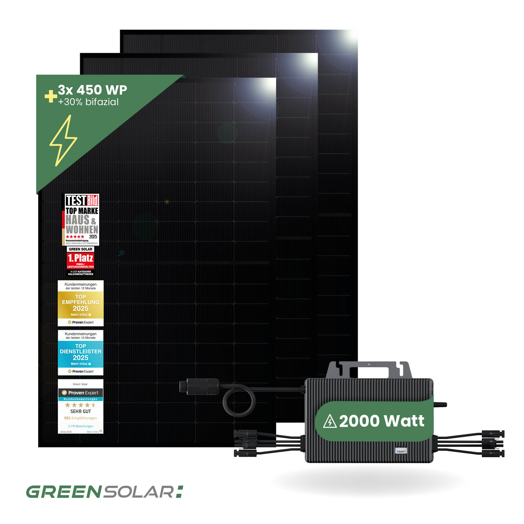 Dein Solarkraftwerk Basic-Set besteht aus 3 bifazialen Modulen mit je 450 Wp Leistung und einem 2000 W Micro-Wechselrichter (TSOL-MS2000(800)). Die notwendigen Anschlusskabel zum Wechselrichter, sind natürlich vormontiert. Der Anschluss an dein Stromnetz muss mittels Schaltschrankmontage von deinem Hauselektriker vorgenommen werden. Alle Basic-Produkte werden ohne Befestigung geliefert, diese kann beim Zubehör dazu ausgewählt werden.