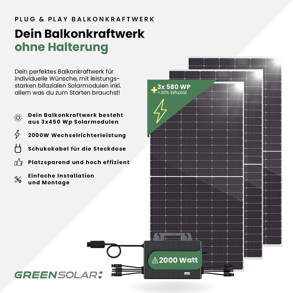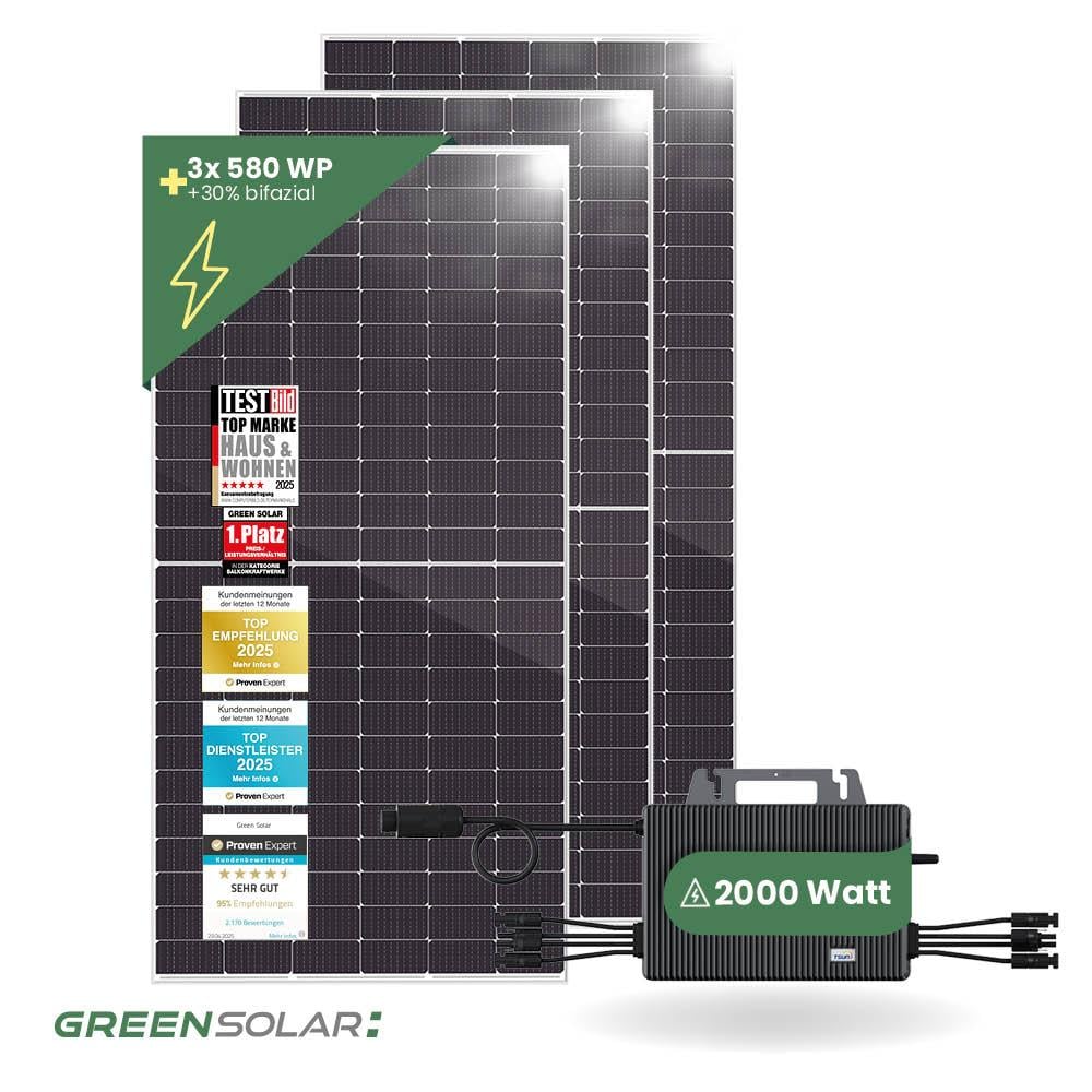 Dein Solarkraftwerk Basic-Set besteht aus 3 bifazialen Modulen mit je 580 Wp Leistung und einem 2000 W Micro-Wechselrichter (TSOL-MS2000). Die notwendigen Anschlusskabel zum Wechselrichter, sind natürlich vormontiert. Der Anschluss an dein Stromnetz muss mittels Schaltschrankmontage von deinem Hauselektriker vorgenommen werden. Alle Basic-Produkte werden ohne Befestigung geliefert, diese kann beim Zubehör dazu ausgewählt werden.