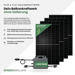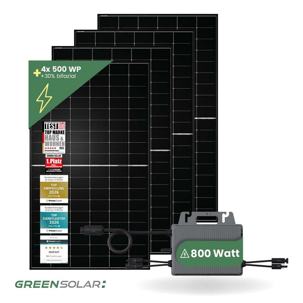 Dieses kompakte Blkonkraftwerk bietet dir einen einfachen Einstieg in die eigene Stromerzeugung. In kürzester Zeit ist alles betriebsbereit: Komponenten auspacken, positionieren und anschließen – schon nutzt du deine eigene Sonnenenergie. Im Set enthalten sind 4 black bifaziale Solarmodule mit 500 Wp Leistung sowie ein passender TSUN Mikrowechselrichter (TSOL-MS2000(800)). Der TSUN 2000(800) ist ein Mikrowechselrichter, der technisch für eine maximale Ausgangsleistung von bis zu 2000 W ausgelegt ist. In der hier angebotenen Variante ist er jedoch softwareseitig auf 800 W gedrosselt, um die gesetzlichen Vorgaben (z. B. in Deutschland und Österreich für Balkonkraftwerke) einzuhalten. Für den Netzanschluss kannst du den gewünschten Stecker ganz einfach auswählen.