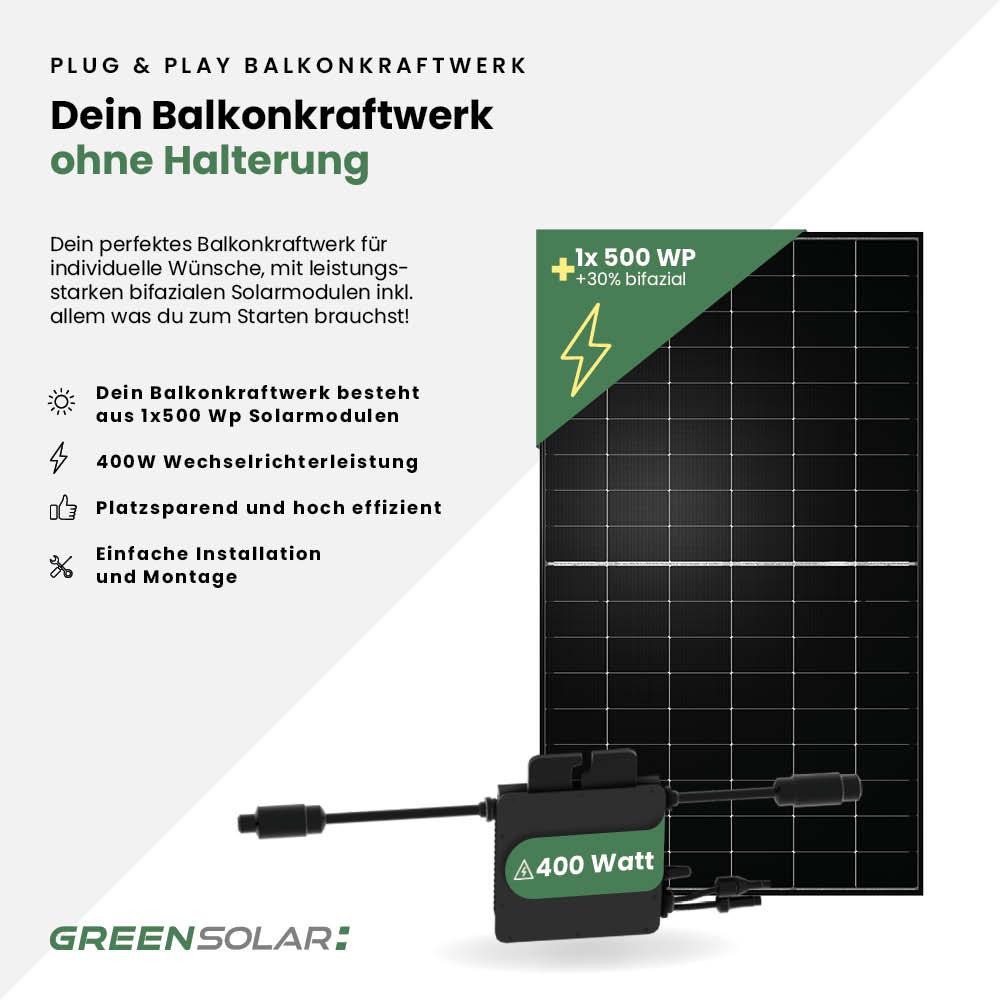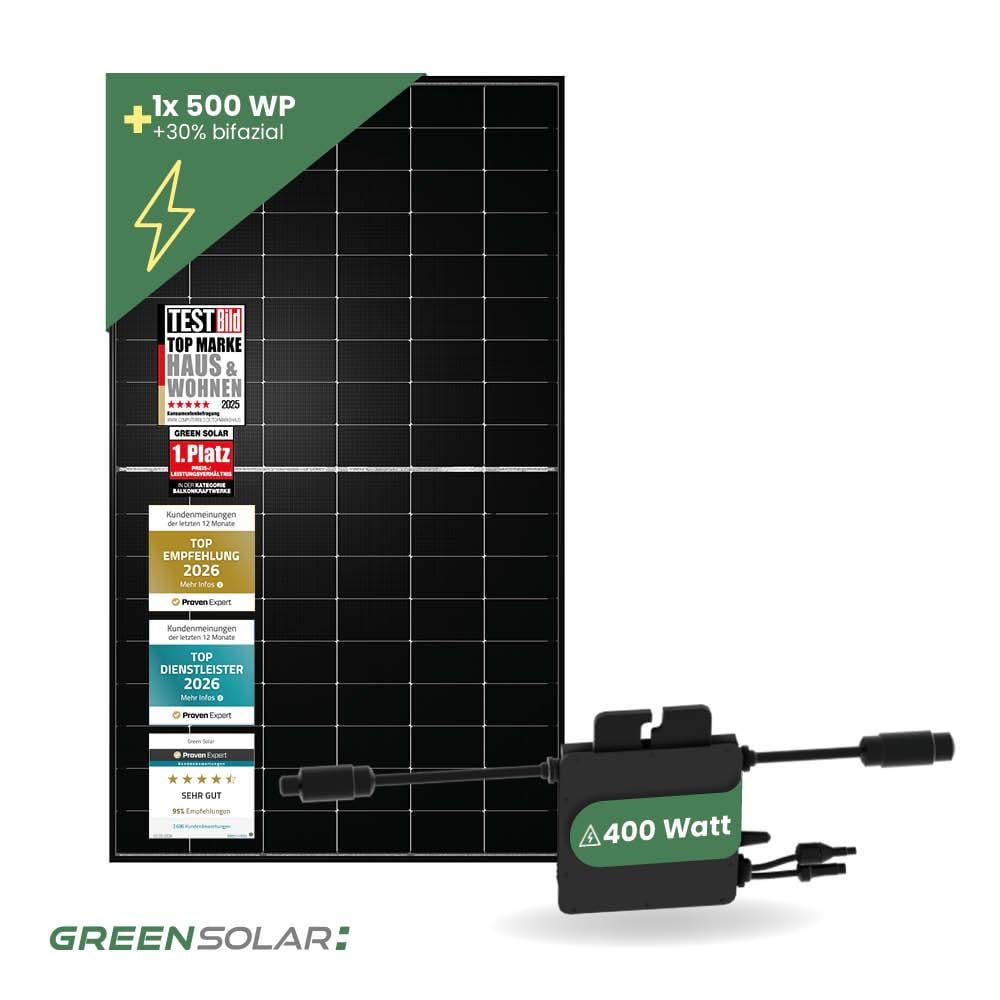 Dieses kompakte Blkonkraftwerk bietet dir einen einfachen Einstieg in die eigene Stromerzeugung. In kürzester Zeit ist alles betriebsbereit: Komponenten auspacken, positionieren und anschließen – schon nutzt du deine eigene Sonnenenergie. Im Set enthalten sind ein bifaziales Solarmodul mit 500 Wp Leistung sowie ein passender Mikrowechselrichter mit 400 W (HM-400). Für den Netzanschluss kannst du den gewünschten Stecker ganz einfach auswählen.