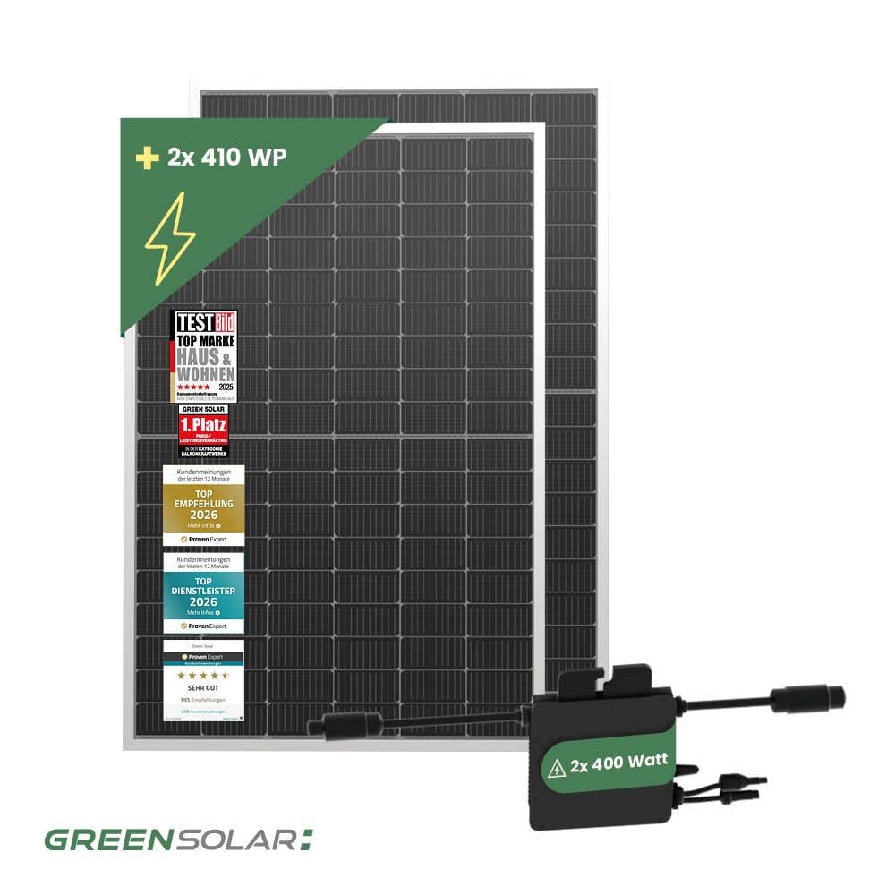 Dein direkter Weg zur eigenen Energiewende: Mit diesem 800 Watt Balkonkraftwerk erzeugst du deinen Strom einfach selbst und speist ihn direkt über die Steckdose ein. Ohne komplizierte Installation: Auspacken, montieren, anschließen und sofort profitieren! Das Set kombiniert zwei leistungsstarke 410 Wp Solarmodule mit zwei effizienten Hoymiles 400W Mikrowechselrichtern für maximale Ausbeute.