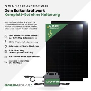 Mit dem Balkonkraftwerk für die Steckdose als Plug & Play Variante erzeugst du in kürzester Zeit deinen eigenen Strom. Das einfache Setup ermöglicht es dir, innerhalb weniger Minuten von Solarenergie zu profitieren – einfach auspacken, aufstellen und anstecken. Das Set umfasst zwei leistungsstarke bifaziale Solarmodule mit je 450 Wp sowie einen TSUN Mikrowechselrichter mit 800W und Wifi (TSOL-MS800), der dir hilft, die erzeugte Energie effizient umzuwandeln und zu nutzen. Die vormontierten Anschlusskabel zum Wechselrichter erleichtern den Aufbau, und der Netzstecker für den Anschluss an die Steckdose ist ebenfalls im Lieferumfang enthalten.
