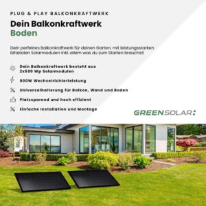 Mit diesem Balkonkraftwerk inklusive Universalhalterung bist du besonders flexibel bei der Platzierung deiner Solaranlage – perfekt geeignet für den Einsatz im Garten, auf der Terrasse oder auf einem Flachdach.Das Set besteht aus zwei leistungsstarken black bifazialen Solarmodulen mit jeweils 500 Wp Leistung sowie dem bewährten TSUN Mikrowechselrichter mit 800 W und integrierter WLAN-Funktion (TSOL-MS800). Damit profitierst du von hoher Effizienz, zuverlässiger Leistung und einer unkomplizierten Nutzung. Die mitgelieferte Universalhalterung ermöglicht dir eine vielseitige und einfache Montage. Du kannst die Module genau dort aufstellen, wo die Sonneneinstrahlung am besten ist – für maximale Energieausbeute und mehr Unabhängigkeit.
