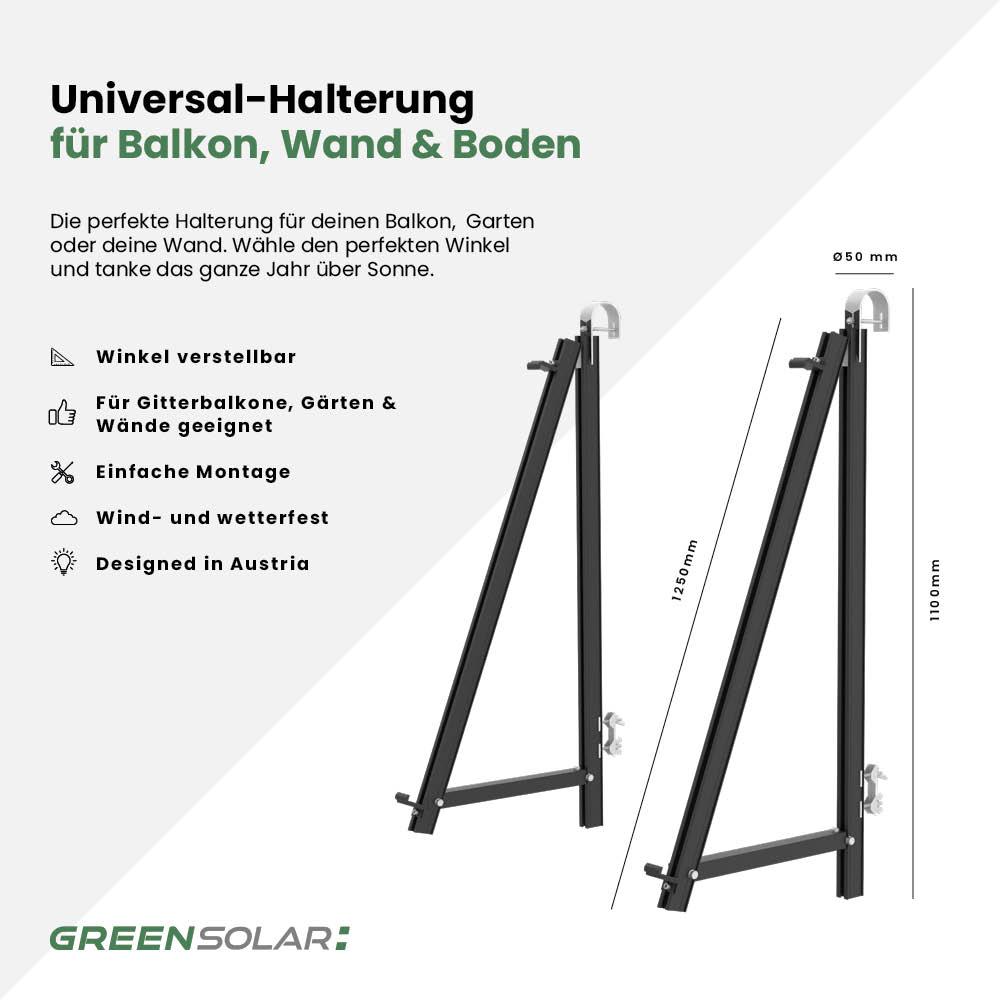 Dieses Set kombiniert zwei hochwertige 450 Wp bifaziale Sonnenkraft-Module mit dem zuverlässigen Hoymiles HMS800 Mikrowechselrichter – für starke Leistung, hohe Erträge und einfache Anwendung. Die Universalhalterung für PV-Module bietet dir maximale Flexibilität bei der Montage – egal ob am Balkon, an der Wand oder auf dem Boden. So kannst du dein Solarmodul genau dort installieren, wo es den besten Ertrag liefert.