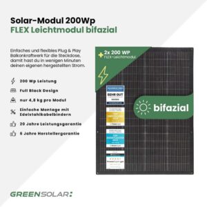 Dieses besonders leichte und flexible Plug & Play Balkonkraftwerk ist ideal für alle, die ihr Solarsystem auf unebenen oder gebogenen Flächen montieren möchten – etwa am Balkongeländer, auf einem Gartenhaus oder an einer Fassadenverkleidung. Zwei flexible bifaziale Photovoltaikmodule mit je 200 Wp und integrierten Ösen ermöglichen eine einfache und sichere Befestigung. Der mitgelieferte HM-400 Mikrowechselrichter wandelt den erzeugten Strom zuverlässig in netzkonformen Wechselstrom um und speist ihn direkt ins Hausnetz ein. Dank vormontierter Anschlusskabel und mitgelieferter Edelstahlkabelbinder ist das System in wenigen Minuten einsatzbereit. Der passende Netzstecker kann individuell ergänzt werden – je nach Anschlussart. Ideal für alle, die eine clevere, platzsparende und sofort einsatzfähige Solarstromlösung suchen.