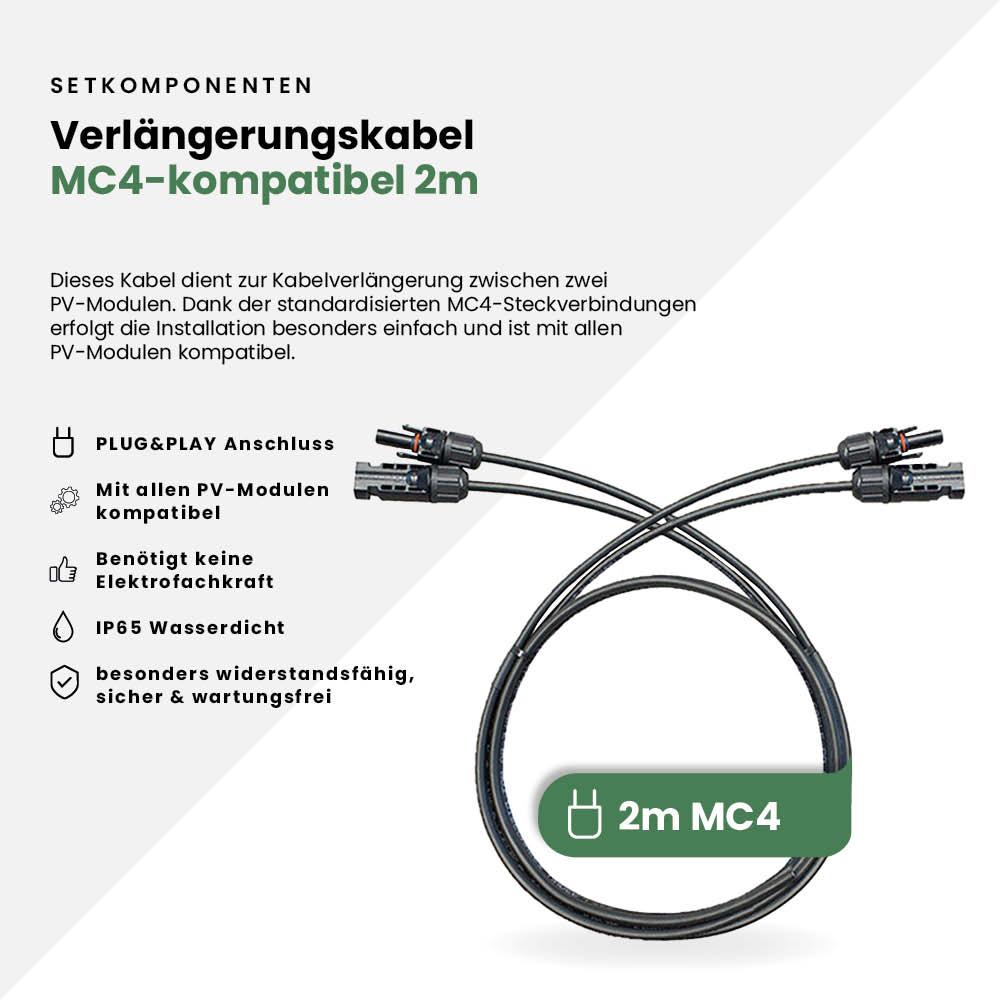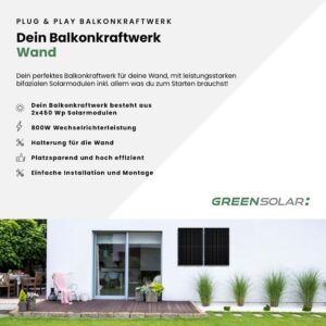 Einfaches und flexibles Plug & Play Photovoltaiksystem für die Steckdose, damit hast du in wenigen Minuten deinen eigenen hergestellten Strom. Einfach auspacken, aufstellen und anstecken, fertig! Der Lieferumfang umfasst alles, was du zum Starten brauchst. Dein Set besteht aus zwei 450Wp bifazial Modulen und einem TSUN Mikrowechselrichter 800W mit Wifi (TSOL-MS800) inklusive zwei einzelnen Wandbefestigungen. Du kannst deine beiden Module also getrennt (max. 1 Meter) voneinander auf der jeweiligen Wand montieren und hast somit auch mehr Flexibilität! Die notwendigen Anschlusskabel zum Wechselrichter, sind natürlich vormontiert. Wähle für den Anschluss an die Steckdose einfach den passenden Netzstecker aus.