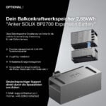 Mit der Anker SOLIX BP2700 Expansion kannst du dein System beliebig ausweiten und noch mehr Solarenergie speichern. Die Installation dieser funktioniert ebenfalls per Plug&Play Technologie und gibt dir die Chance, noch mehr Solarstrom durch deine Module aufzunehmen. Diese lohnt sich besonders, wenn du vor hast, dein Balkonkraftwerk zu erweitern.