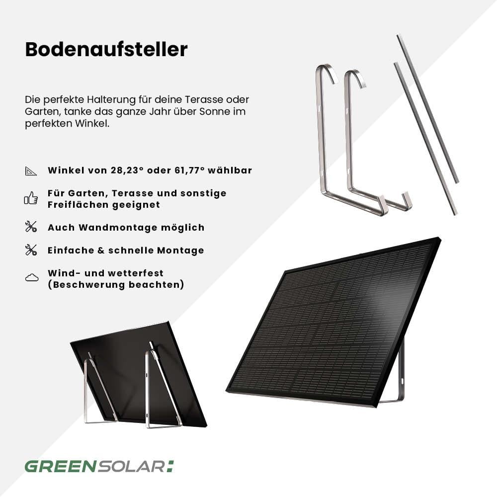 Der Bodenaufsteller für 4 Module ermöglicht dir eine effiziente und flexible Montage deiner Solarmodule – ganz ohne Dachdurchdringung. Die Module werden quer montiert und können in einem Neigungswinkel von 28,23° oder 61,77° eingestellt werden. Durch die südseitige Ausrichtung erreichst du über den gesamten Tag hinweg eine optimale Umwandlung von Sonnenlicht in Strom. Die Aufstellung erfolgt ganz einfach im Garten oder auf der Terrasse – alternativ ist auch eine Wandmontage im 61,77°-Winkel möglich. Alle Bauteile sind witterungsbeständig und für den langfristigen Außeneinsatz konzipiert. Die durchdachte Konstruktion sorgt für eine optimale Flächennutzung und einen hohen Wirkungsgrad deiner Solaranlage. Detaillierte Hinweise zur Beschwerung und zum Aufbau findest du in unserer Montageanleitung im Downloadbereich.