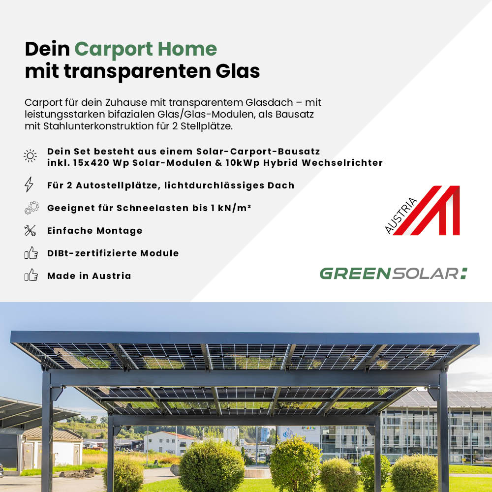 Carport 2 Stellplätze Glas/Glas – 1kn – 6,3kWp inkl. 10kWp Hybrid WR