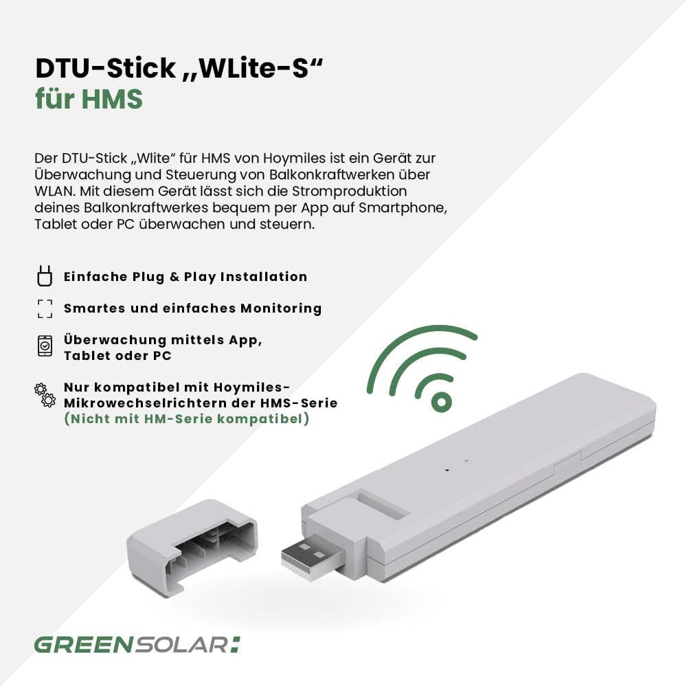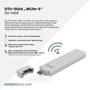 Der DTU-Stick „Wlite-S“ ist die smarte Lösung zur Überwachung und Steuerung deines Balkonkraftwerks mit HMS-Wechselrichtern. Er wird einfach per Plug & Play installiert und erfasst die Daten über WLAN von bis zu vier Mikro-Wechselrichtern gleichzeitig. Diese Informationen werden direkt an die Hoymiles S-Miles Cloud übermittelt und lassen sich bequem per App auf dem Smartphone, Tablet oder PC einsehen. So kannst du jederzeit die Leistung deines Systems prüfen, Warnmeldungen erhalten oder die maximale Einspeiseleistung individuell anpassen. Der Stick eignet sich ideal für PV-Anlagen bis 1500W und macht dein System fit für smartes Monitoring und einfache Fernwartung. Der neue DTU-Stick ist laut Hersteller mit allen derzeit erhältlichen Wechselrichtern kompatibel, mit Ausnahme der HM-Serie.