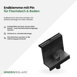 Die Endklemme 35AC mit vormontiertem Pin in Schwarz ist speziell für die sichere Befestigung der Green Solar Glasmodule auf Flachdach- und Bodenaufstellern ausgelegt. Sie sorgt für festen Halt und eine stabile Montage – ganz ohne zusätzliches Werkzeug. Die Klemme wird direkt auf dem Befestigungssystem montiert und ist passgenau auf das Green Solar System abgestimmt. Für ein Solarmodul werden in der Regel 4 Endklemmen benötigt. Die robuste Verarbeitung garantiert langlebigen Halt – ideal für den Einsatz im Freien bei jeder Witterung.