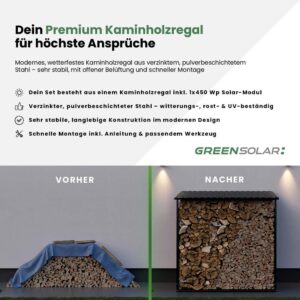 Unser hochwertiges Kaminholzregal überzeugt mit modernem Design und robuster Bauweise aus verzinktem, pulverbeschichtetem Stahl – witterungsbeständig, rostfrei und UV-resistent. Mit 3,45 m³ Lagerkapazität bietet es viel Platz, auch für 1-Meter-Stücke. Die offene Konstruktion sorgt für optimale Belüftung und der Aufbau ist schnell erledigt. Ergänzt wird dieses Regal mit einem 450 Wp PV-Modul – ideal für die dezentrale Stromerzeugung. Kompakt, leistungsstark und effizient. Die Installation ist unkompliziert und der erzeugte Strom wird sofort im Haushalt genutzt.