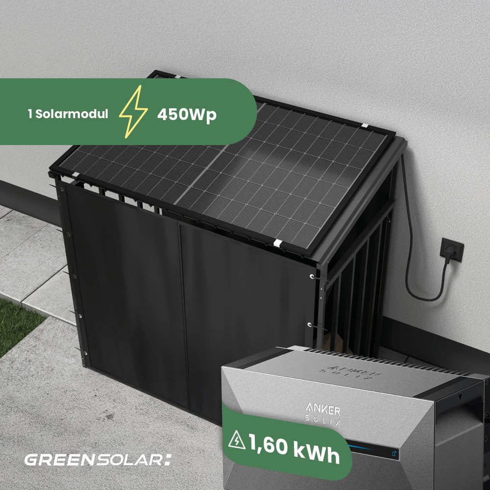 Kaminholzregal mit Balkonkraftwerk 450 Wp und Batteriespeicher Anker SOLIX Solarbank 2 E1600 inkl. Plane