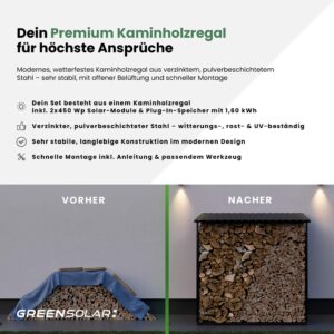 Unsere hochwertigen Kaminholzregale überzeugen mit modernem Design und robuster Bauweise aus verzinktem, pulverbeschichtetem Stahl – witterungsbeständig, rostfrei und UV-resistent. Mit je 3,45 m³ Lagerkapazität bietet sie viel Platz, auch für 1-Meter-Stücke. Die offene Konstruktion sorgt für optimale Belüftung und der Aufbau ist schnell erledigt. Ergänzt wird jedes Regal mit einem 450 Wp PV-Modul – ideal für die dezentrale Stromerzeugung. Kompakt, leistungsstark und effizient. Die Installation ist unkompliziert und der erzeugte Strom wird für die weitere Verwendung effizient gespeichert.