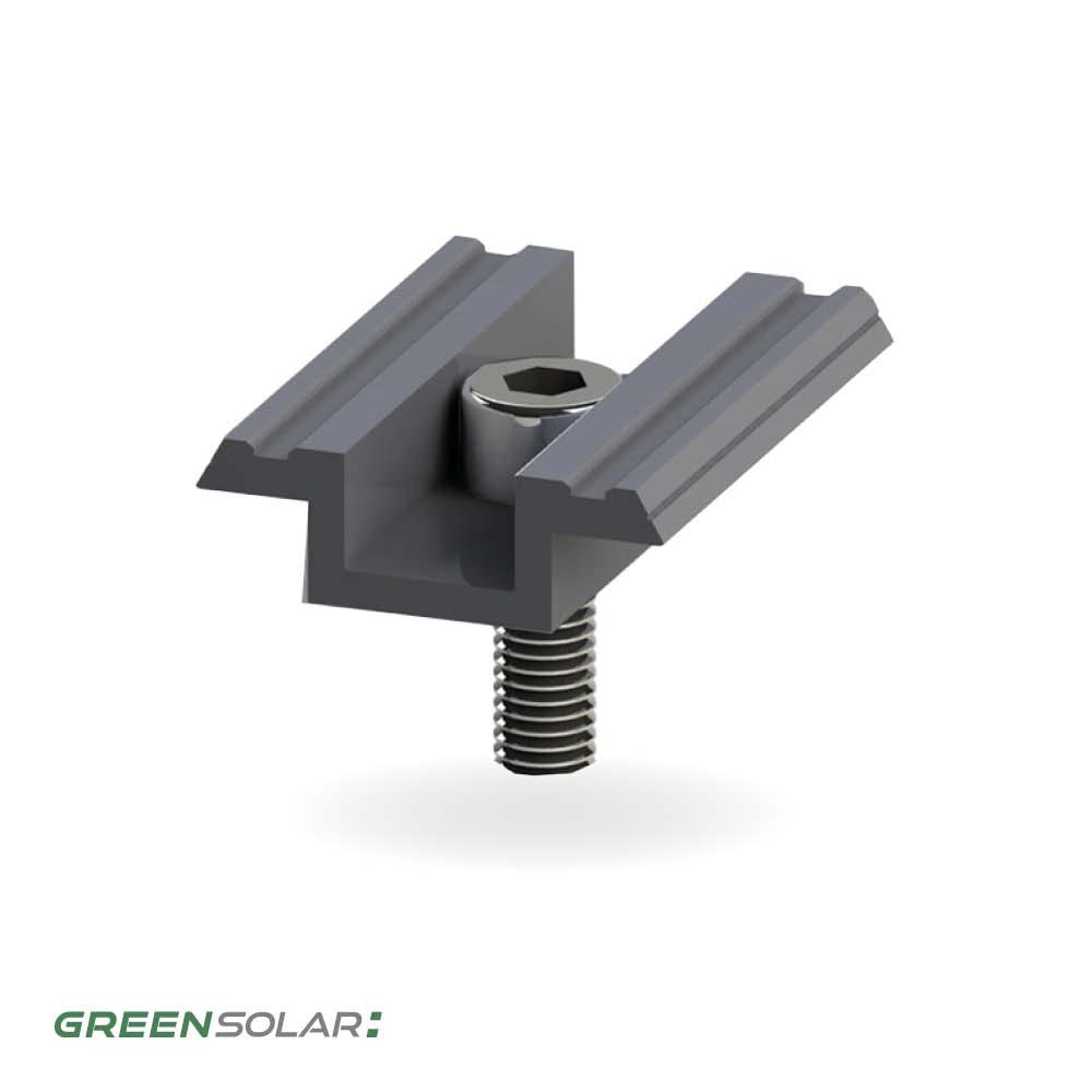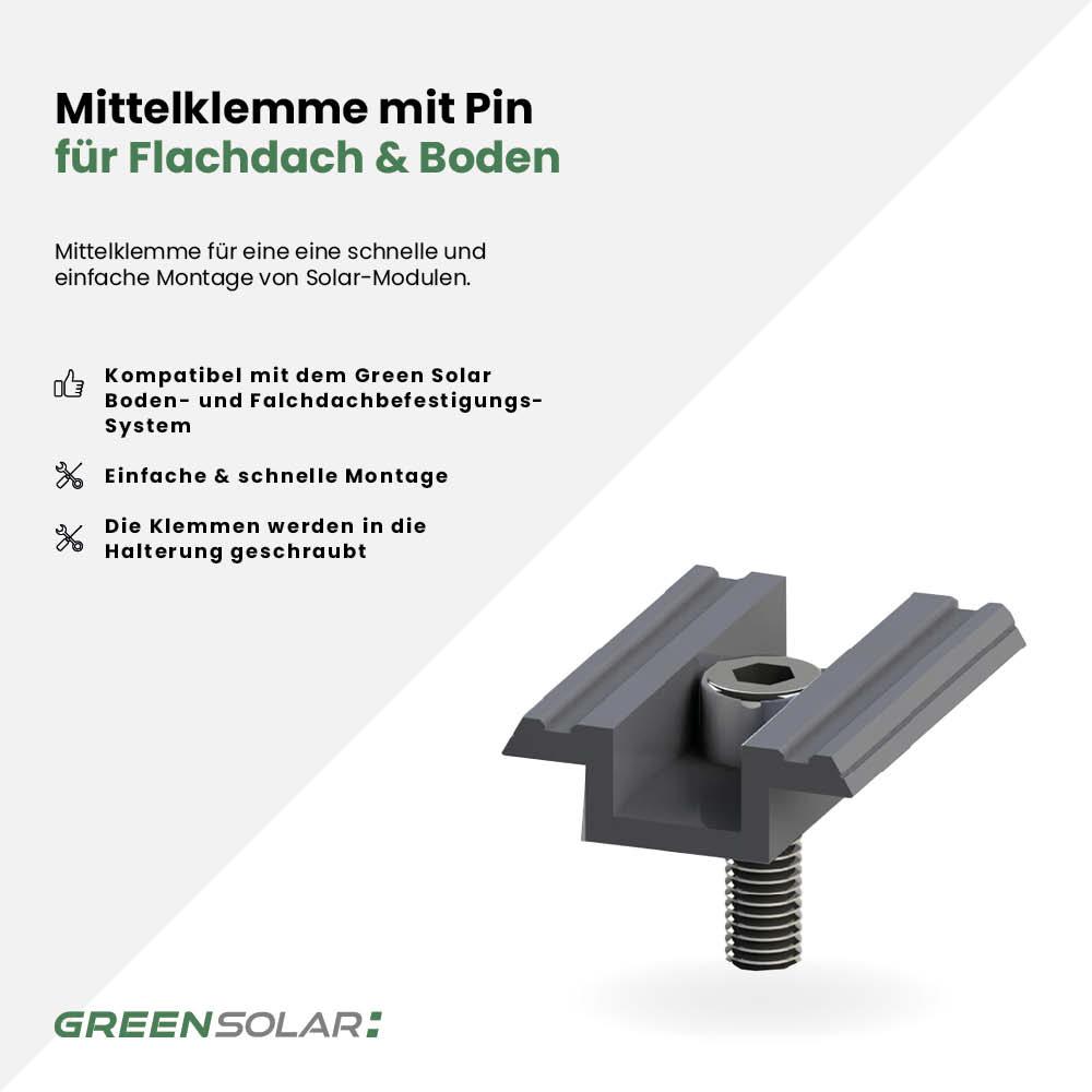 Die Mittelklemme mit Pin (35AC, schwarz) wird verwendet, um zwei nebeneinanderliegende Green Solar Glasmodule sicher miteinander zu verbinden – ideal für die Montage auf Flachdach- und Bodenbefestigungssystemen. Die Klemme wird direkt auf den Green Solar Bodenaufstellern befestigt und sorgt für stabilen Halt, selbst bei Wind und Wetter. Neben der Standardmontage zwischen zwei Modulen kann die Mittelklemme auch zusätzlich zur Verstärkung genutzt werden, um die Stabilität der gesamten Anlage weiter zu erhöhen. Eine robuste, wetterfeste Lösung für eine sichere Solarmodulbefestigung im Außenbereich.