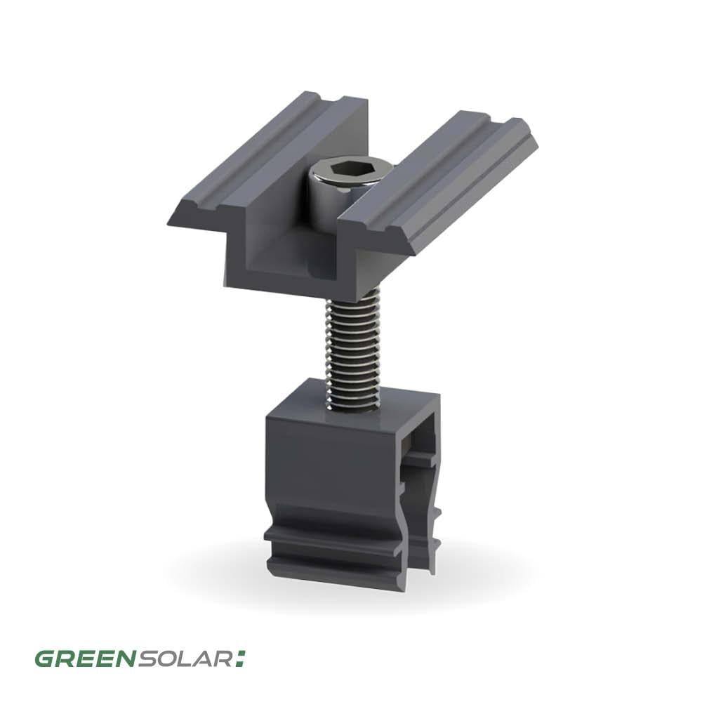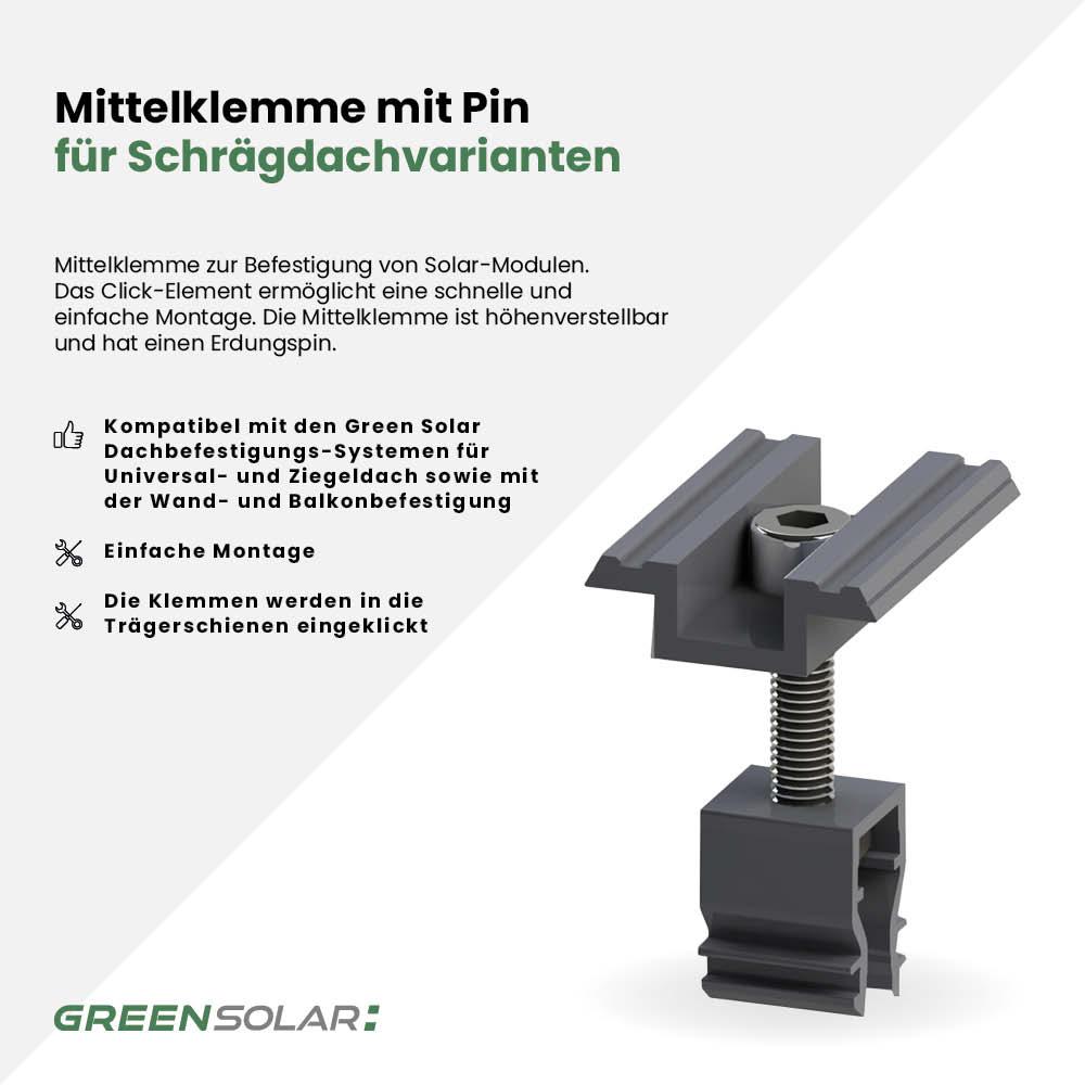 Die Mittelklemme mit Pin (35AC, schwarz) wird zur Verbindung und Befestigung von zwei nebeneinanderliegenden Green Solar Glasmodulen eingesetzt – ideal für Montagen auf Schrägdächern, Wänden und Balkonen. Sie ist vollständig kompatibel mit den Green Solar Befestigungssystemen für Universal- und Ziegeldächer. Die Klemme wird einfach in die Trägerschienen eingeklickt und sorgt für sicheren Halt zwischen den Modulen. In der Regel benötigst du zwei Mittelklemmen pro Modulübergang. Für zusätzliche Stabilität können auch mehrere Mittelklemmen verwendet werden. Eine robuste und zuverlässige Lösung für eine langlebige PV-Installation auf geneigten Flächen.