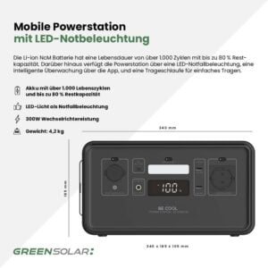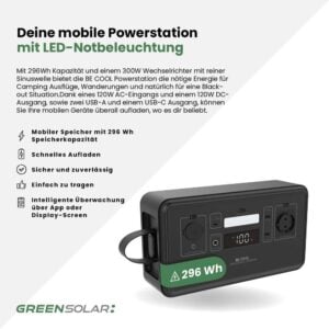 Die Mobile Powerstation 296Wh mit LED-Notbeleuchtung ist die ideale Lösung für alle, die unterwegs auf zuverlässige Energiequelle angewiesen sind. Mit einer Kapazität von 296 Wh und einem 300W Wechselrichter versorgt sie verschiedene Geräte wie Smartphones, Laptops oder kleine Haushaltsgeräte. Sie bietet vielseitige Anschlussmöglichkeiten, darunter einen 120W AC-Eingang, einen 120W DC-Ausgang sowie USB-A und USB-C. Dank der langlebigen Li-Ion NcM-Batterie mit über 1.000 Ladezyklen bleibt die Powerstation auch nach vielen Einsätzen weiterhin leistungsfähig. Ihre praktische LED-Notbeleuchtung sorgt für zusätzliche Sicherheit, und die App ermöglicht eine intelligente Überwachung des Energieverbrauchs. Mit einem Gewicht von nur 4,2 kg und einer handlichen Trageschlaufe ist die Powerstation besonders leicht zu transportieren, sodass sie auf Campingausflügen, Wanderungen oder bei Stromausfällen stets einsatzbereit ist.