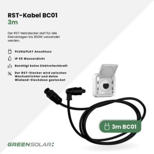 Das RST-Kabel BC01 (3 m) mit Wieland-Steckverbindung bietet dir eine sichere, normkonforme und wetterfeste Lösung zur Verbindung deines HM-Wechselrichters mit dem Hausnetz – ideal für Plug-&-Play-Balkonkraftwerke bis 800 W. Dank des integrierten RST20-/Betteri BC01-Stecksystems ist das Kabel mit allen Hoymiles-Wechselrichtern der HM-Serie kompatibel (nicht geeignet für HMS-Serie) und sorgt für eine zuverlässige Stromübertragung. Die hochwertige Verarbeitung nach IP65 schützt die Komponenten effektiv vor Wasser und Schmutz – perfekt für den dauerhaften Einsatz im Außenbereich. In Österreich ist der Einsatz des Wieland-Steckers bei Anlagen bis 800 W offiziell zulässig, sodass du dein System unkompliziert direkt an die Steckdose anschließen kannst.