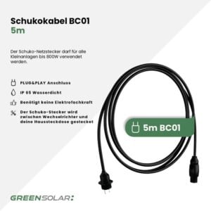 Das 5m lange Schukokabel BC01 ermöglicht dir eine sichere und einfache Verbindung deines Wechselrichters mit dem Hausnetz. Es ist kompatibel mit allen Wechselrichtern und eignet sich ideal für den Betrieb von Balkonkraftwerken. Dank IP65-Schutz ist es auch im Außenbereich zuverlässig einsetzbar. In Österreich darf der Schuko-Stecker bei Anlagen unter 800Wp offiziell verwendet werden – damit speist du den erzeugten Strom ganz unkompliziert direkt ins Hausnetz ein.