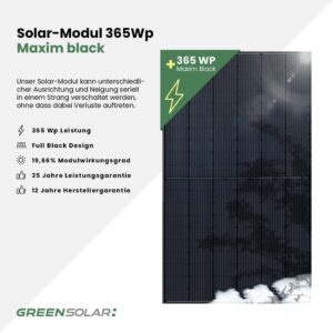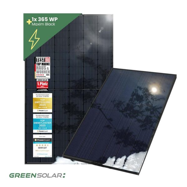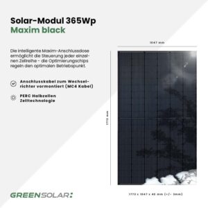 Das 365Wp HC Maxim black Modul ist dein Einstieg in die Welt der Solarenergie – ganz ohne komplizierte Installation. Als Plug & Play Balkonkraftwerk ist es in wenigen Minuten einsatzbereit: auspacken, aufstellen, anstecken – fertig! Die Anschlusskabel zum Wechselrichter sind bereits vormontiert, du musst nur noch den passenden Netzstecker auswählen und los geht’s. Mit einer Größe von 1773×1047×40mm und einem Gewicht von nur 20,3kg lässt sich das Modul flexibel auf Balkon, Terrasse oder im Garten positionieren. Bitte beachte: Die Befestigung ist nicht im Lieferumfang enthalten, kann aber ganz einfach im Zubehörbereich individuell ergänzt werden.