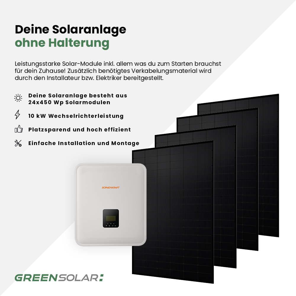 Die 10 kWp Photovoltaikanlage von Sonnenkraft ist die ideale Lösung für Haushalte oder Betriebe mit erhöhtem Energiebedarf. Sie bietet dir die Möglichkeit, deinen Stromverbrauch umweltfreundlich, effizient und zukunftssicher zu decken. Unter optimalen Bedingungen kann das System bis zu 10 Kilowattstunden pro Stunde erzeugen – ideal, um Elektrofahrzeuge zu laden, Wärmepumpen zu betreiben oder gleich mehrere Haushaltsgeräte gleichzeitig mit Sonnenstrom zu versorgen.Die 24 bifazialen 450 Wp Solarmodule nutzen sowohl direktes als auch reflektiertes Licht und erzielen dadurch besonders hohe Erträge. Der Sonnenkraft Wechselrichter (10 kW, 3-phasig) mit zwei MPP-Trackern sorgt für höchste Flexibilität – auch bei unterschiedlich ausgerichteten Dachflächen. Die optionale Notstromfunktion in Verbindung mit einem passenden Speicher bietet zusätzliche Sicherheit bei Stromausfällen. Perfekt für alle, die ihre Solaranlage flexibel planen und eigene Halterungslösungen verwenden möchten.