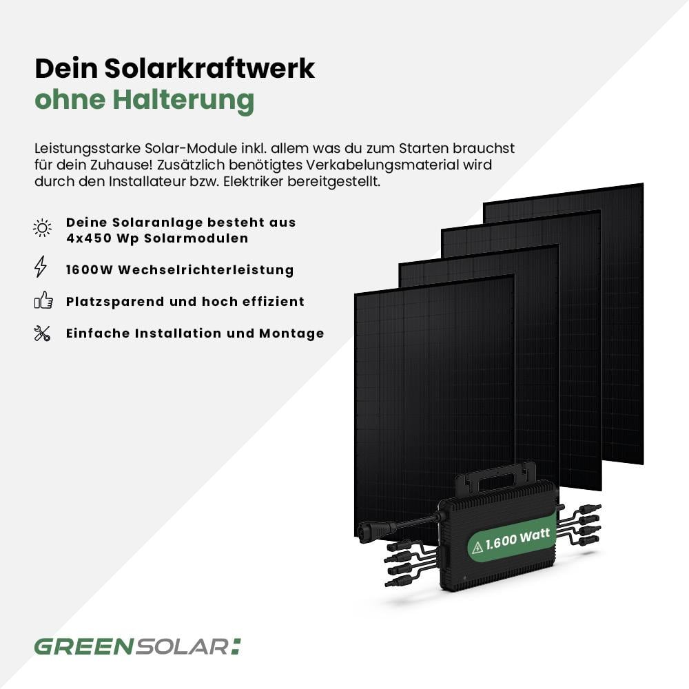 Unser Solarkraftwerk 1800/1600 ist nicht nur ein Eyecatcher für deinen Außenbereich, sondern versorgt dich auch noch mit grünem Strom! Die Module können in verschiedenen Varianten verwendet werden und auf bis zu drei Sets erweiterbar. Dein Solarkraftwerk Basic-Set besteht aus 4 bifazialen Modulen mit je 450 Wp Leistung und einem 1600 W Micro-Wechselrichter (HMS-1600-4T). Die notwendigen Anschlusskabel zum Wechselrichter, sind natürlich vormontiert. Der Anschluss an dein Stromnetz muss mittels Schaltschrankmontage von deinem Hauselektriker vorgenommen werden. Alle Basic-Produkte werden ohne Befestigung geliefert, diese kann beim Zubehör dazu ausgewählt werden.