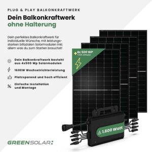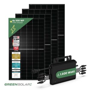 Im Set enthalten sind 4 hochwertige black bifaziale Solarmodule mit jeweils 500 Wp Leistung. Sie nutzen nicht nur direktes Sonnenlicht, sondern auch reflektierte Strahlung und sorgen so für besonders hohe Erträge. Ergänzt wird das System durch einen kraftvollen Mikrowechselrichter mit 1600 W Leistung (HMS-1600-4T) und integrierter WLAN-Funktion. Eine starke Kombination aus Leistung, Effizienz und moderner Technik – ideal für alle, die mehr aus der Sonne herausholen möchten.