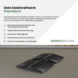 Dein Solarkraftwerk Flachdach-Komplettset besteht aus 4 bifazialen Modulen mit je 450 Wp Leistung und einem 1600W Micro-Wechselrichter (HMS-1600-4T) und unserer 4er-Flachdach-Befestigung. Der Lieferumfang umfasst alles, was du zum Starten brauchst. Du kannst die Module entweder auf deinem Flachdach oder im Garten aufstellen! Die Module werden in Ost-West Ausrichtung auf der Flachdach-Befestigung quer montiert. Die notwendigen Anschlusskabel zum Wechselrichter, sind natürlich vormontiert. Der Anschluss an dein Stromnetz muss mittels Schaltschrankmontage von deinem Hauselektriker vorgenommen werden.