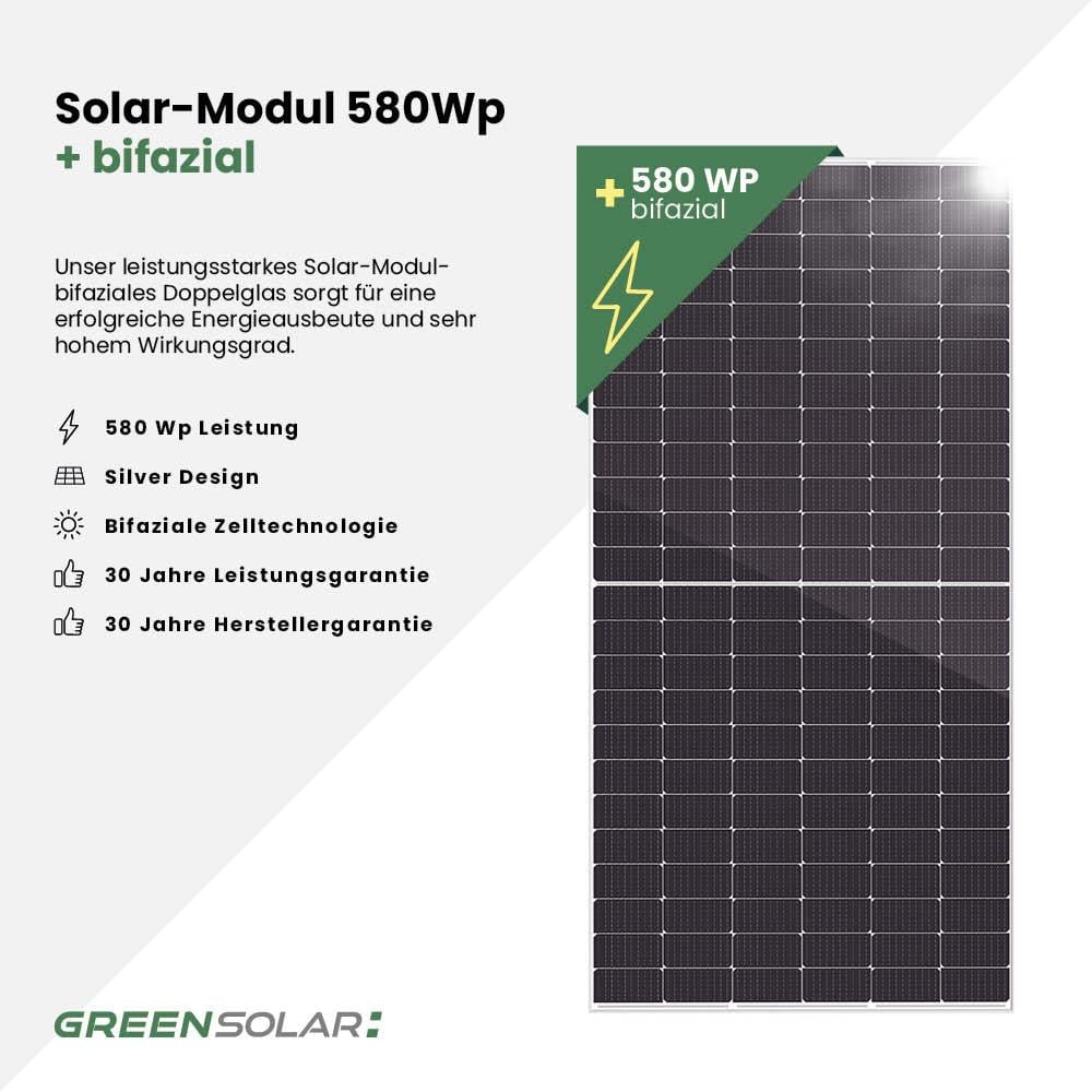 - 1x 580 Wp Solarmodul (bifazial, Plug & Play)