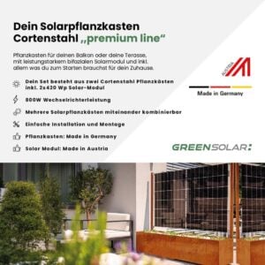 Der Solarpflanzkasten 840/800 Cortenstahl bifazial vereint erstklassige Qualität, modernes Design und fortschrittliche Solartechnologie.