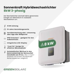 Der Sonnenkraft Hybridwechselrichter 8kW 3-phasig ist die Spitze der Solarenergie-Optimierung und bietet nicht nur eine hohe Leistung, sondern auch eine integrierte Notstromfunktion für dein Zuhause. Mit zwei MPP-Trackern sorgt er für eine optimale Anpassung an die jeweiligen Bedingungen und maximiert so die Energieerzeugung. Der Wechselrichter ist IP65-zertifiziert und kann somit problemlos im Außenbereich installiert werden. Bei einem Netzausfall schaltet der Wechselrichter innerhalb von nur 20 ms automatisch in den Notstrombetrieb und versorgt ausgewählte Haushaltsverbraucher mit Energie, die durch deine PV-Anlage oder den Sonnenkraft-Batteriespeicher betrieben wird. Das Komplettset enthält zudem ein WLAN-Modul für die Überwachung und ein Smart Meter, um den Energieverbrauch und die Leistung genau zu messen.