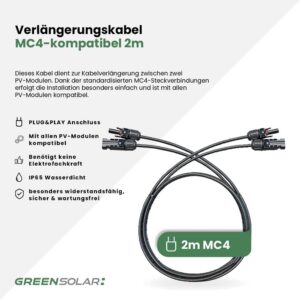 Dieses MC4-kompatible Verlängerungskabel-Set besteht aus zwei einzelnen Kabeln, jeweils 2 Meter lang – ideal, um Solarmodule flexibel miteinander zu verbinden oder den Abstand zum Wechselrichter zu überbrücken. Dank der standardisierten Steckverbindungen ist das Set mit allen PV-Modulen kompatibel und lässt sich schnell und einfach installieren. Die wetterfeste Ausführung mit einem Kabelquerschnitt von 4mm² sorgt für zuverlässige Stromübertragung – selbst bei anspruchsvollen Bedingungen im Außenbereich. Langlebig, sicher und wartungsfrei.