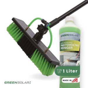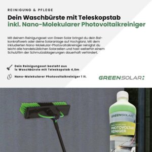 Mit diesem Komplettset aus Waschbürste und Reinigungsmittel sorgst du im Handumdrehen für saubere Solarmodule und maximale Leistung. Die Waschbürste mit ihrer 4,6m langen Teleskopstange ermöglicht dir eine flexible und komfortable Reinigung – selbst an schwer erreichbaren Stellen wie Dachflächen, Balkonkraftwerken, Fassaden oder Poolrändern. Die mitgelieferten Komponenten wie Drehverbindung, Ventilhahn, Schlauchanschluss und Seifenbehälter machen die Handhabung besonders einfach. Der Seifenbehälter lässt sich mit Reinigungsmittel befüllen und dosieren – einfach an den Gartenschlauch anschließen und loslegen. Der enthaltene Nano-Molekulare Photovoltaikreiniger (1l) ergänzt das Set perfekt: Er ist leicht alkalisch, hochkonzentriert und extrem ergiebig (nur 5% Verdünnung notwendig). Er entfernt zuverlässig Fett, Öl, Ruß, Feinstaub, Pollen und andere Umweltrückstände und hinterlässt einen langanhaltenden Abperleffekt sowie einen Schutzfilm, der künftige Verschmutzungen reduziert. Ideal für die schonende Reinigung aller handelsüblichen Solarpaneele. Ein rundum durchdachtes Set für die Pflege deines Balkonkraftwerks oder deiner gesamten Solaranlage – für effiziente Reinigung und langanhaltende Leistung.Photovoltaikreiniger: Made in Austria.