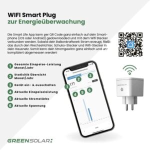 Mit dem WiFi Smart Plug kannst du ganz einfach den Stromgewinn deines Balkonkraftwerks überwachen – direkt auf deinem Smartphone. Der Stecker wird zwischen den Schuko-Stecker deines Wechselrichters und die Haussteckdose gesteckt. Die Verbindung zur Smart Life App erfolgt unkompliziert per QR-Code, und schon siehst du, wie viel Strom dein System einspeist. Neben der übersichtlichen Verbrauchsanzeige bietet der Smart Plug auch einen integrierten Überspannungsschutz für zusätzliche Sicherheit. Die App funktioniert auf iOS- und Android-Geräten und ist sogar mit Amazon Alexa und Google Home kompatibel – so hast du jederzeit volle Kontrolle über deine Energie.